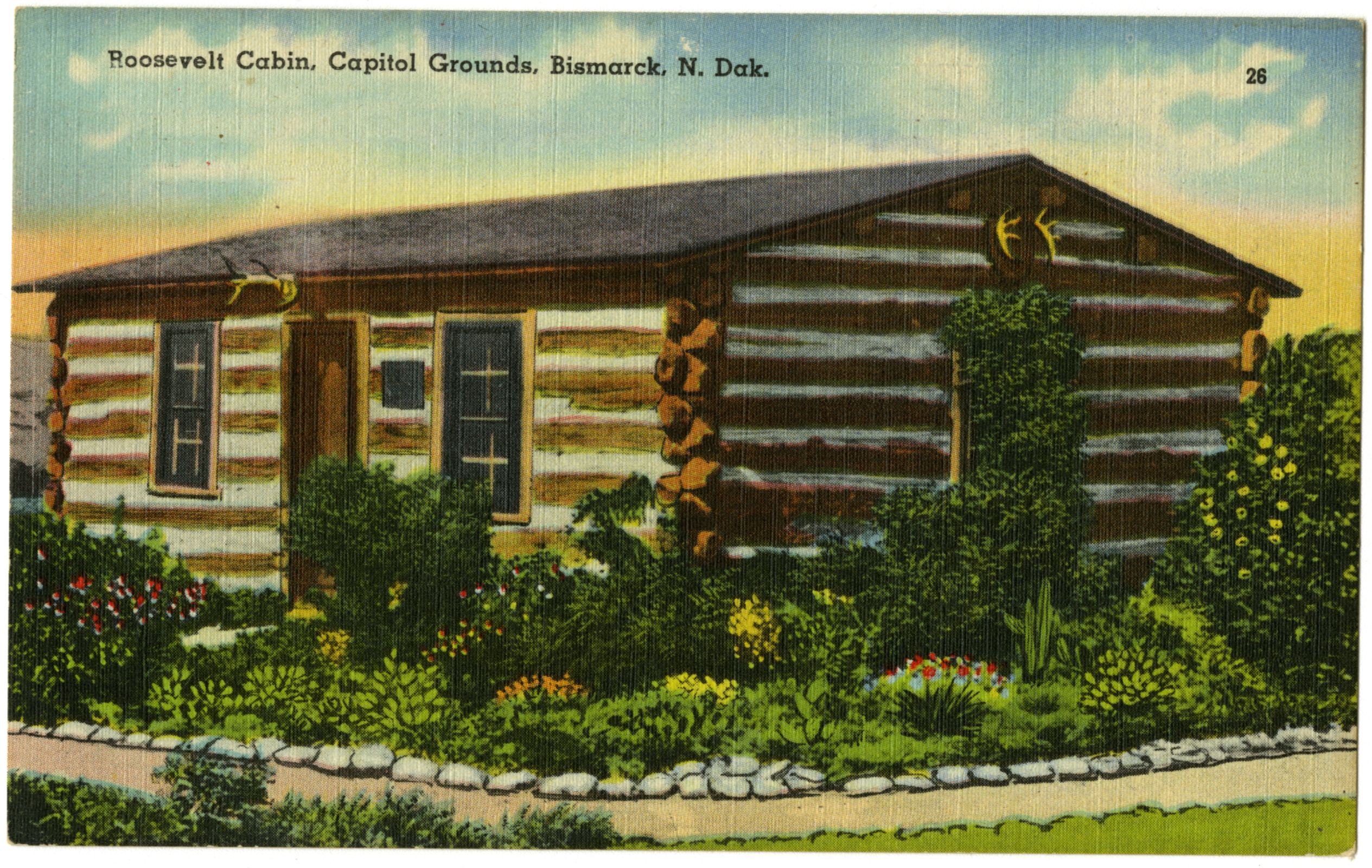 Color postcard depicting Theodore Roosevelt’s cabin in Bismarck, North Dakota. On the back, Thelma and J. Carroll Baisch write to the latter’s mother that they are planning to go through Montana tomorrow. Everything so far has looked very dry.