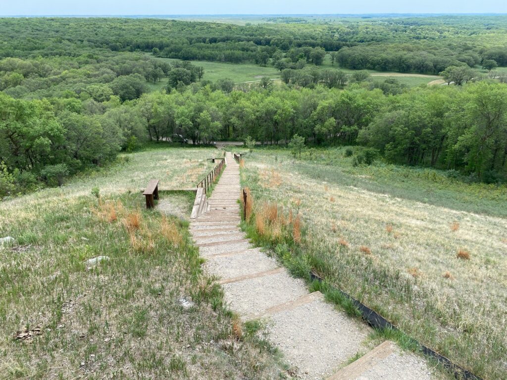 Today, White Horse Hill National Game Preserve consists of 1674 acres. Bison, elk, and even prairie dogs are established in the refuge, and the trees and water attract over 214 species of birds. There is a short drive through the middle of the preserve, and a few hiking trails in the areas where bison don’t roam. There is also an astounding climb to an amazing view at the top of the hill consisting of 193 steps. Or is it 175? By the time people get to the top, they forget the count.