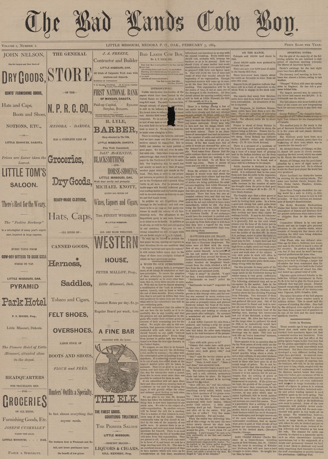 Packard came to Medora on the Northern Pacific Railroad in early 1884. He was just 22 years old, but he had already served a colorful turn as the editor of the Bismarck Tribune. The first issue of the Bad Lands Cow Boy, the newspaper he founded in Medora, appeared on February 7, 1884. It was, said Packard, “not . . . for fun, but for $2 per year.”