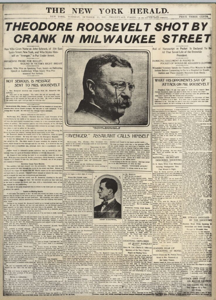 Historians look to a letter of September 15, 1912, found on Schrank after the assassination attempt, to explain his motives. The document suggests that he opposed a third presidential term, but it also recounts a dream in which President McKinley appeared to Schrank, blaming Theodore Roosevelt for his death and directing Schrank to seek revenge. Presumably because of this, Schrank followed Roosevelt, the Progressive Party candidate, on the 1912 presidential campaign tour. He saw his chance on October 14, as Roosevelt was leaving Milwaukee’s Gilpatrick Hotel and readying to deliver a stump speech. Just before Roosevelt stepped into a waiting car, Schrank pulled out a 38 Colt revolver and shot Theodore Roosevelt at close range. Deciding that he was not mortally wounded, Roosevelt stopped the angry crowd from harming Schrank and then delivered his hour-long address, stunning the audience at the Milwaukee Auditorium when he stated calmly, “I don’t know whether you fully understand that I have just been shot; but it takes more than that to kill a Bull Moose.” Meanwhile, local police took Schrank into custody.