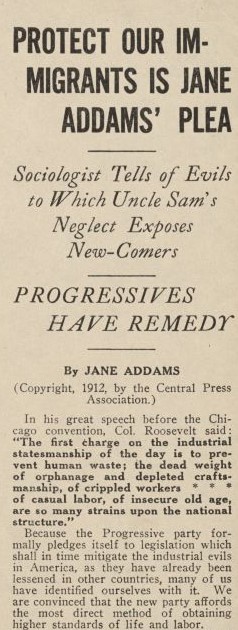 Theodore Roosevelt visited Hull-House several times during and after his presidency and he and Addams became political allies. They worked closely together on Roosevelt’s 1912 presidential campaign, as Addams was heavily involved in the Progressive Party. At its convention in Chicago, Addams argued that to achieve their policy goals, Progressives would “require a leader of invincible courage, of open mind, of democratic sympathies, one endowed with power to interpret the common man and to identify himself with the common lot.”1 She thought Roosevelt was that person and seconded his nomination while emphasizing the importance of women’s suffrage in achieving their policy agenda. In Roosevelt, Addams found her political champion for suffrage; at a campaign stop in Vermont, Roosevelt defended Addams and the other women who participated in the convention from some negative press coverage, arguing, the “real issues affect women precisely as much as men” and women “have precisely the same right to speak in politics.”2