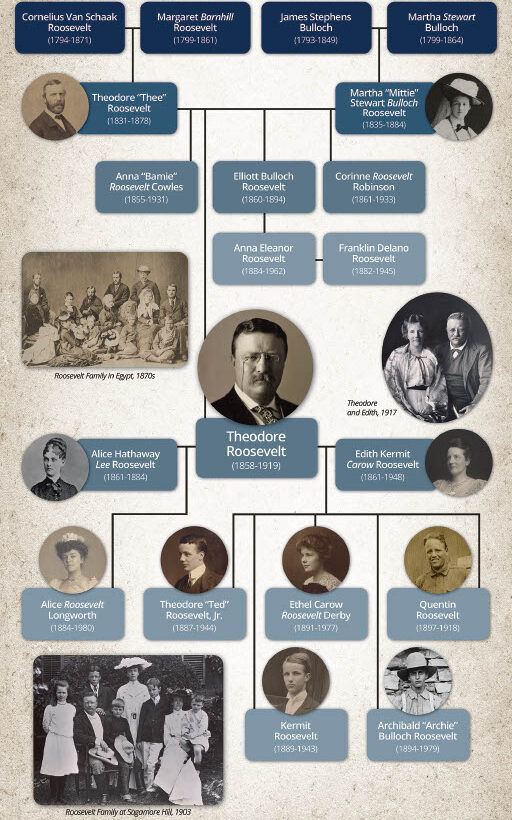 This basic family tree depicts Roosevelt’s lineage from his grandparents through to his children. Click here to download a high-resolution PDF file.