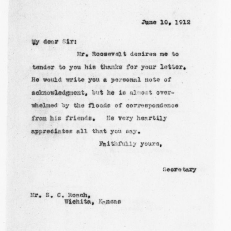 When I started my cataloging duties for the Theodore Roosevelt Center, I had no idea how many form letters I would encounter over just four days, between June 10 and June 14, 1912. A large majority of them were from Roosevelt’s secretary at the time, Frank Harper, although he has “signed” just two: one to Judge Ben B. Lindsey on June 10 and one to Senator Joseph M. Dixon on June 12. While Roosevelt himself tendered form letters, none of the ones I cataloged contained even a signature, just an empty space under the valediction for him to sign!