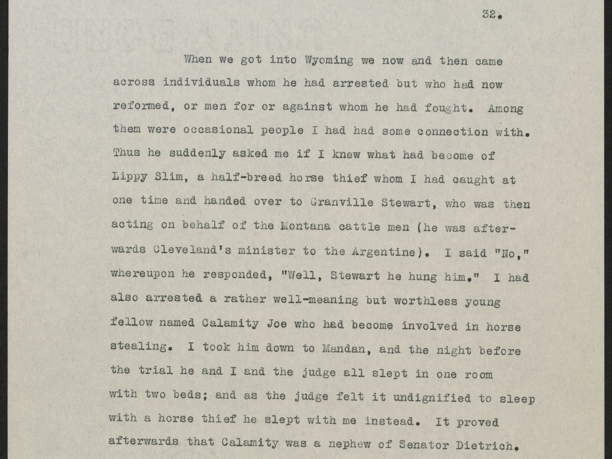 In 1886, Roosevelt wrote to his sister Corinne about how he brought in three thieves– the last two days by himself. Although he describes the conditions and how he had to stay watchful, he never went into detail as to what the men had done or who they were. I found it a fascinating letter, one that tends to reinforce an almost Hollywood vision of the old west. [Editor’s note: this is the famous boat thieves episode, one of the iconic stories of Roosevelt’s time in North Dakota.]