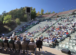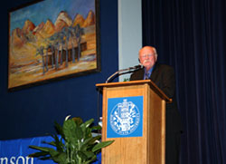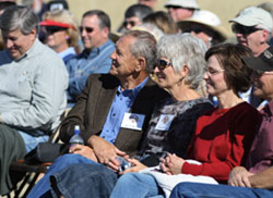 Also included as part of the symposium was a field trip to Medora to see the Eberts Ranch on the east bank of the Little Missouri River. The acquisition of the 5,200-acre Eberts Ranch by the U.S. Forest Service insures that the view Theodore Roosevelt enjoyed from the veranda of his 30 x 60-foot Elkhorn Ranch will be protected forever. Symposium moderator and DSU Theodore Roosevelt Scholar in Residence Clay Jenkinson marked the occasion with a moving tribute to the Eberts family, Theodore Roosevelt and the Dakota badlands. That afternoon, prominent government officials and representatives of private conservation groups, including the Boone and Crockett Club, founded by Roosevelt in 1887, commemorated the historic purchase of the Eberts Ranch with a program at the Burning Hills Amphitheater in Medora.